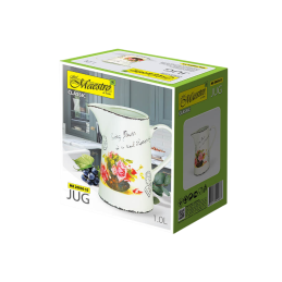 Elegantiškas 1 litro talpos ąsotis – praktiškas ir dekoratyvus indas, puikiai tinkantis vandeniui, sultims, pienui ar kitiems gėrimams patiekti. Klasikinio stiliaus dizainas su subtiliais dekoratyviniais motyvais suteikia jaukumo virtuvei ar stalui. Patogi rankena ir pylimo snapelis užtikrina komfortišką naudojimą kasdien.