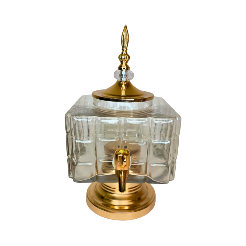 Šis elegantiškas 3 litrų talpos gėrimų dozatorius suteiks jūsų stalui išskirtinumo ir prabangos. Pagamintas iš tvirto, dekoratyvinio stiklo su reljefiniu paviršiumi, jis tvirtai stovi ant masyvaus auksuoto pagrindo. Auksuotas dangtelis su dekoratyviniu kristalo akcentu suteikia ypatingo žavesio, o patogus kranelis leidžia lengvai pilstyti vandenį, limonadą, sultis ar kitus gėrimus.