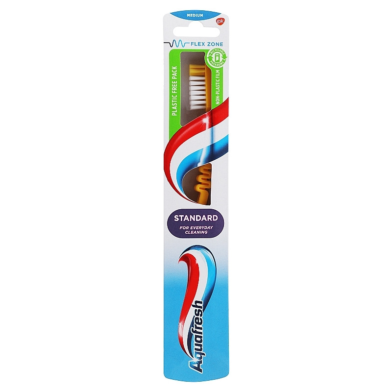 Aquafresh Standard dantų šepetėlis (Medium) skirtas kasdienei burnos higienai. Klasikinės formos šepetėlio galvutė padeda patogiai pasiekti dantis, o ergonomiška rankena užtikrina patogų laikymą rankoje. Lanksti „Flex Zone“ zona prisitaiko prie spaudimo valant dantis, todėl naudojimas yra komfortiškas.