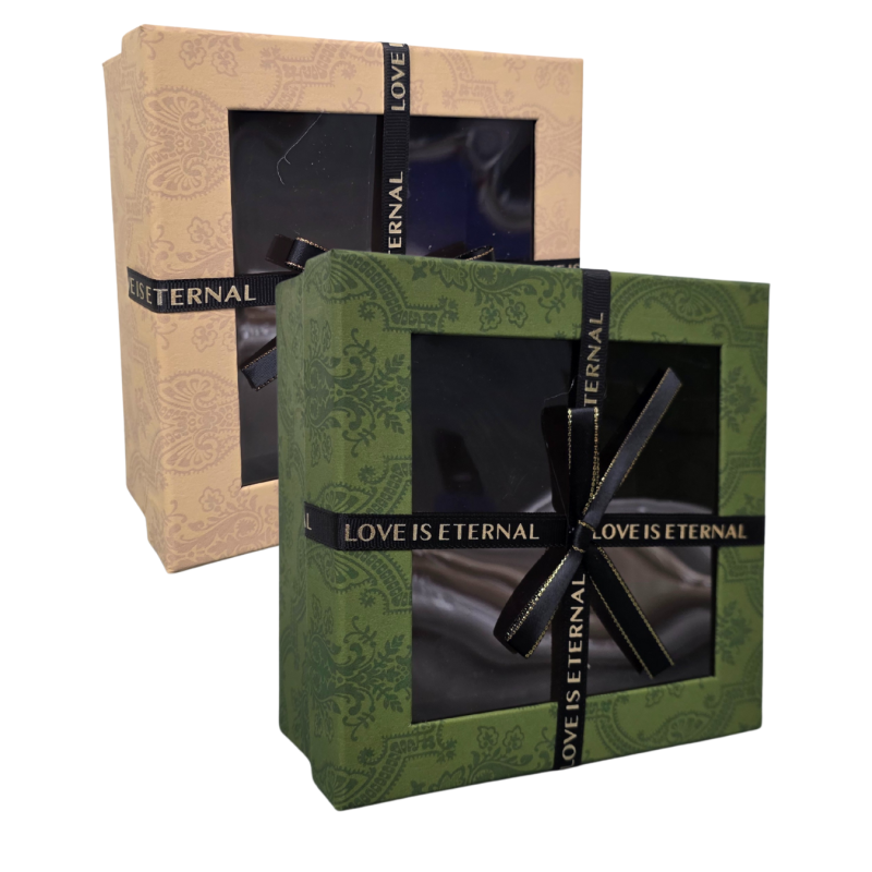 Prabangi dovanų dėžutė su langeliu ir juodu kaspinu – elegantiškas pasirinkimas ypatingai progai. Dėžutės langelis leidžia matyti viduje esančią dovaną.