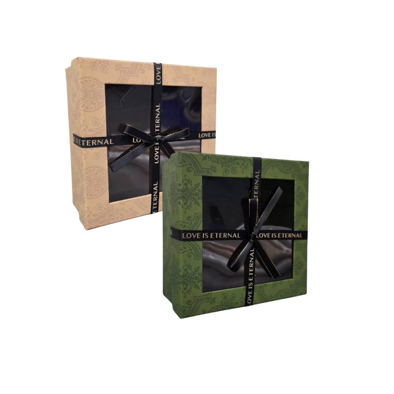 Prabangi dovanų dėžutė su langeliu ir juodu kaspinu – elegantiškas pasirinkimas ypatingai progai. Dėžutės langelis leidžia matyti viduje esančią dovaną.