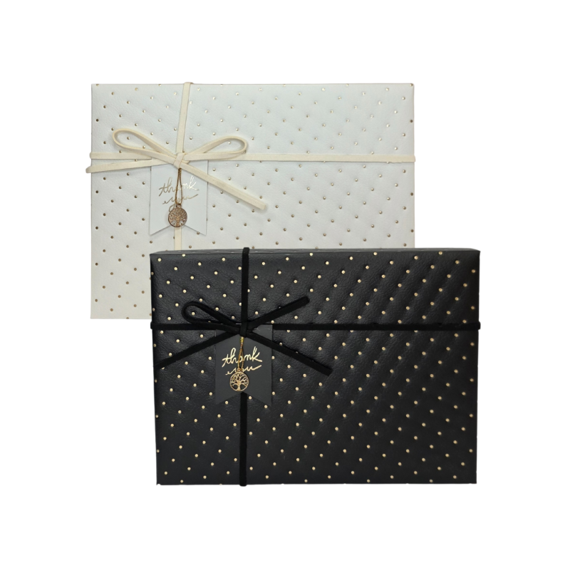 Elegantiška dovanų dėžutė su subtiliais auksiniais taškeliais – klasikinis ir prabangus pasirinkimas dovanoms. Dėžutė puošta kaspinu ir pakabuku su užrašu Thank you, suteikiančiu ypatingo dėmesio pojūtį. Tvirta konstrukcija ir kruopščiai apgalvotas dizainas paverčia ją puikia dovanos pakuote be papildomo įpakavimo.