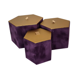 Prabangi šešiakampė dovanų dėžutė, pagaminta iš minkšto aksominio audinio, su auksiniu dangteliu ir rankenėle.