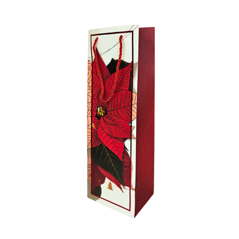 Elegantiškas dovanų maišelis su šventišku raudonų žiedų motyvu – puikus pasirinkimas kalėdinėms dovanoms ar kitoms progoms. Pagamintas iš kokybiško, blizgaus popieriaus su tvirta virvele patogiam nešimui. Ryškios spalvos ir prabangus dizainas suteikia dovanai išskirtinumo bei šventinės nuotaikos.