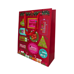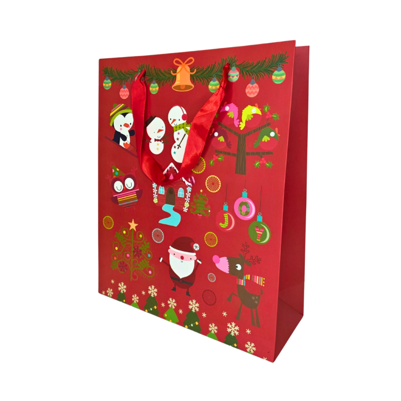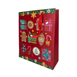 Ryškūs raudoni dovanų maišeliai su kalėdiniais piešiniais – imbieriniais sausainiais, Kalėdų seneliu, elniu, dovanomis ir šventiniais užrašais. Kiekvienas maišelis dekoruotas spalvingais elementais, kurie suteikia dovanoms linksmumo ir šventinės nuotaikos. Pagaminti iš tvirto popieriaus, su plačiomis raudonomis atlasinėmis rankenomis.