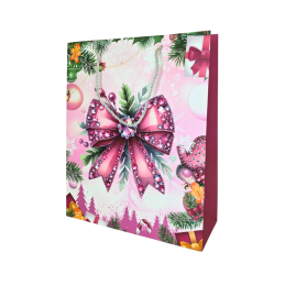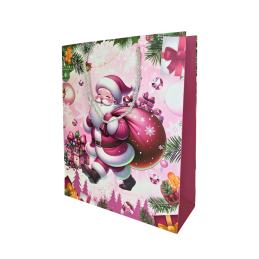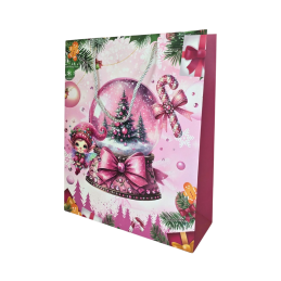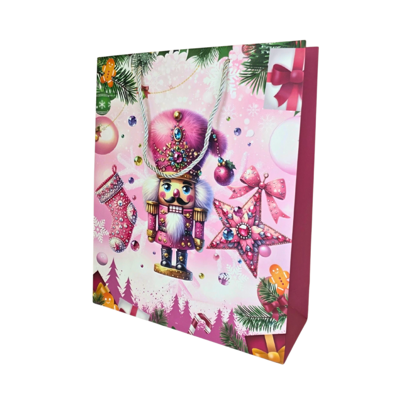 Šventiški rožiniai dovanų maišeliai su ryškiais kalėdiniais piešiniais – Kalėdų seneliu, spragtuku, kaspinu ir sniego rutuliu. Kiekvienas maišelis spindi žaismingomis spalvomis ir detalėmis, suteikiančiomis dovanai šventiškumo bei žavesio. Pagaminti iš tvirto, blizgaus popieriaus, su patogiomis virvelinėmis rankenomis.