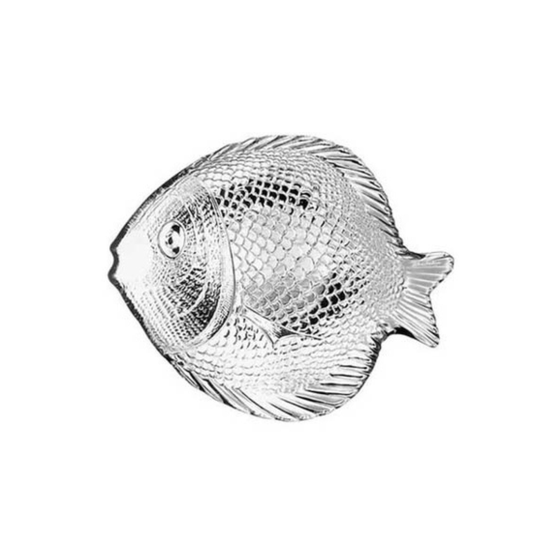 Dekoratyvi skaidraus stiklo lėkštė žuvies formos – stilingas pasirinkimas patiekti užkandžius, žuvies patiekalus ar jūros gėrybes. Išraiškingas reljefas suteikia stalui išskirtinumo.