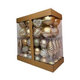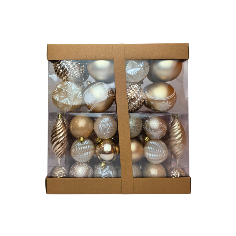 Kalėdiniai eglutės žaisliukai – prabangus ir rafinuotas rinkinys, kuris jūsų eglutei suteiks subtilios šviesos ir elegancijos. Auksiniai ir šampano atspalviai harmoningai dera tarpusavyje, o skirtingų tekstūrų žaisliukai – matiniai, blizgūs, su raštais ir blizgučiais – kuria išskirtinį vizualinį efektą. Supakuota stilingoje dėžutėje su perrišimu – puiki dovanos idėja ar šventinis akcentas jūsų namams.