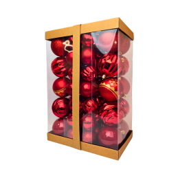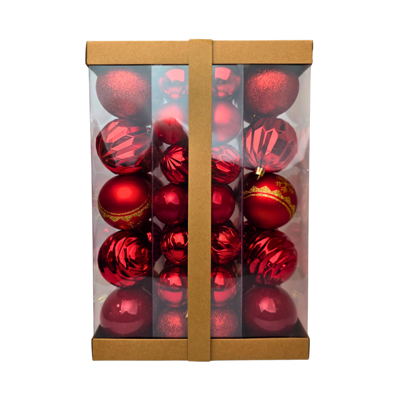Kalėdiniai eglutės žaisliukai – klasikinis ir šventiškas rinkinys, spindintis ryškia raudona spalva. Derinami matiniai, blizgūs, blizgučiais dengti ir raštuoti burbulai sukuria išskirtinį spindesį bei suteikia eglutei tradicinės Kalėdų šilumos. Tai puikus pasirinkimas norintiems sukurti jaukų ir elegantišką šventinį dekorą.