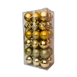 Kalėdiniai eglutės žaisliukai – prabanga alsuojantis aukso spalvos rinkinys, sukuriantis šiltą ir šventišką atmosferą Jūsų namuose. Rinkinyje derinami matiniai, blizgūs, blizgučiais dengti ir raštuoti burbulai, kurie suteikia eglutei išskirtinio žavesio bei spindesio.