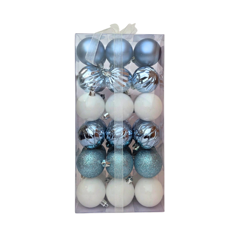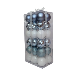 Kalėdiniai eglutės žaisliukai – elegantiškas ir šventiškas rinkinys, kuris suteiks Jūsų namams žiemos jaukumo ir blizgesio. Rinkinyje rasite įvairių atspalvių mėlynos, baltos ir sidabrinės spalvos žaisliukus – matinio, blizgaus ir blizgučiais dengto paviršiaus. Jie puikiai dera tarpusavyje ir suteikia eglutei subtilaus išskirtinumo.