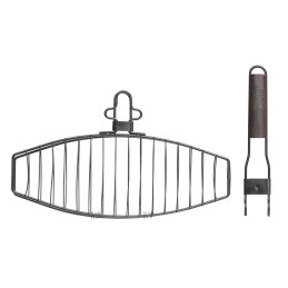Praktiškos ir patogios grilio grotelės, skirtos žuvies bei kitų maisto produktų kepimui ant grilio ar laužo. Dviguba grotelių konstrukcija leidžia saugiai užfiksuoti maistą, todėl jį galima lengvai apversti nebijant, kad gabalai subyrės ar prilips prie grotelių. Tai ypač patogu kepant žuvį, daržoves ar plonesnius mėsos gabalus.