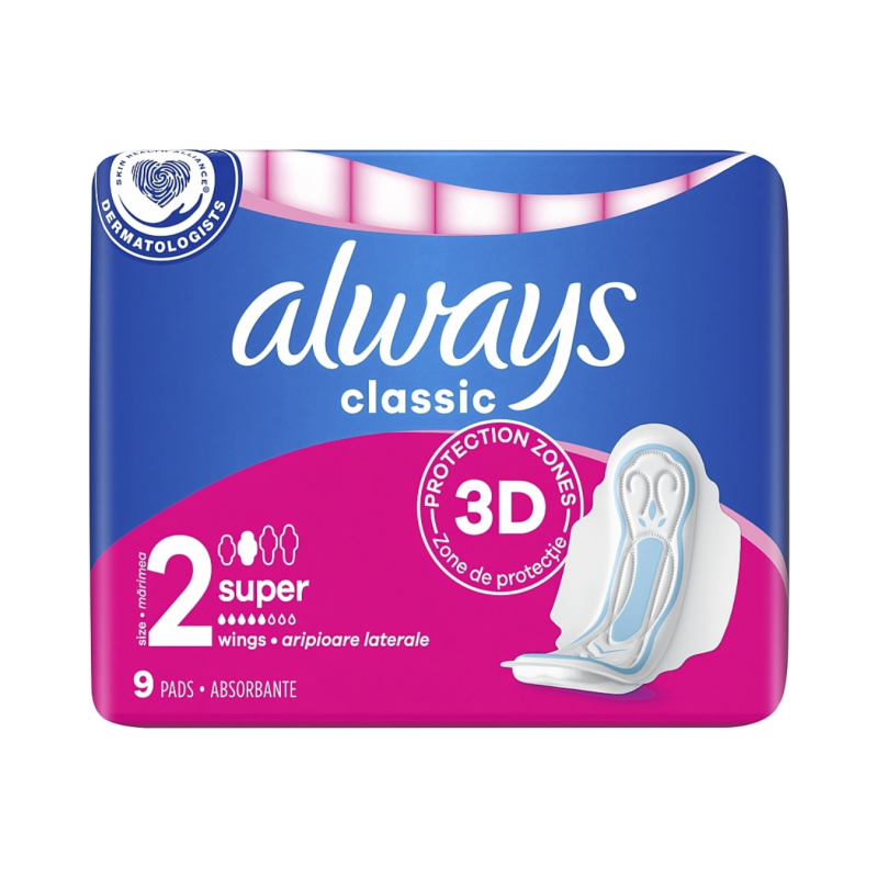 „Always Classic Super“ – tai patikimi higieniniai paketai, sukurti užtikrinti efektyvią apsaugą ir kasdienį komfortą menstruacijų metu. Jie tinka gausesniam nei vidutiniam (super) menstruacijų srautui ir padeda jaustis saugiai visą dieną.