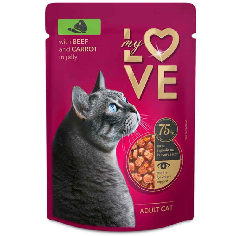 My Love Visavertis konservuotas ėdalas suaugusioms katėms su jautiena ir morkomis drebučiuose