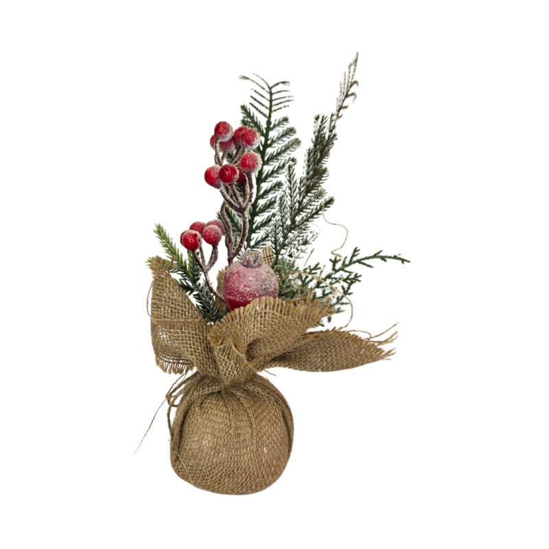 Kalėdinė dekoracija „Žiemos uogos“ – elegantiška ir jauki puošmena, įnešanti natūralumo bei šventinės nuotaikos į jūsų namus. Kompozicijoje dera žali spygliuočių ūgliai, sniegu apibarstytos raudonos uogos ir subtiliai apšerkšniję lapeliai. Dekoracija įvyniota į džiuto audinį ir perrišta kaspinu, kuris suteikia kaimiško žavesio ir šilumos pojūtį. Puikiai tinka stalo, palangės ar lentynos papuošimui.