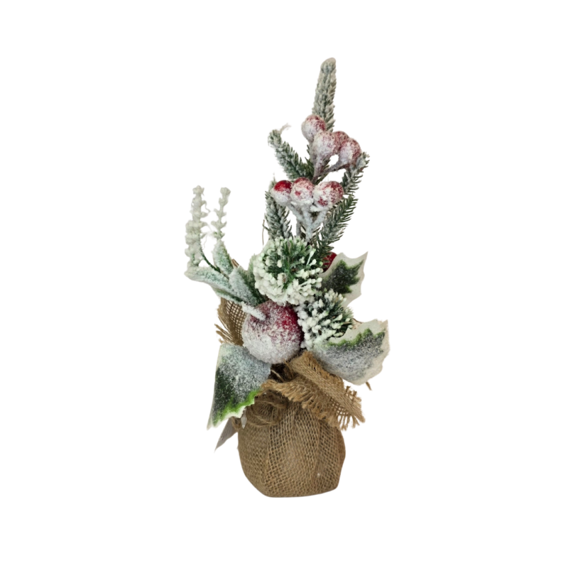 Kalėdinė dekoracija „Snieguota šakelė“ – subtili ir jauki puošmena, puikiai papildysianti jūsų šventinį interjerą. Kompozicijoje dera žali eglių spygliai, balti sniegu padengti žiedai ir ryškūs raudoni vaisiai, suteikiantys šilumos ir natūralumo pojūtį. Dekoracija įvyniota į džiuto audinį ir perrišta kaspinu, todėl atrodo itin stilingai bei dera prie klasikinių ar kaimiško stiliaus Kalėdų dekoro sprendimų. Puikiai tinka pastatyti ant palangės, stalo ar lentynos.