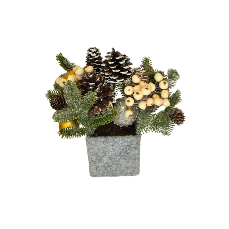 Kalėdinė dekoracija „Kankorėžių kompozicija“ – žavingas šventinis akcentas, sukuriantis jaukią žiemos atmosferą jūsų namuose. Kompozicijoje dera žali spygliuočių ūgliai, balti uogų kekeliai, blizgantis kamuoliukas ir natūralūs kankorėžiai, padengti dirbtinio sniego sluoksniu. Visi elementai tvarkingai sudėti į elegantišką pilką veltinio pagrindą, kuris suteikia dekoracijai šiuolaikiško paprastumo. Puikiai tinka stalui, palangei ar dovanai artimam žmogui.