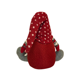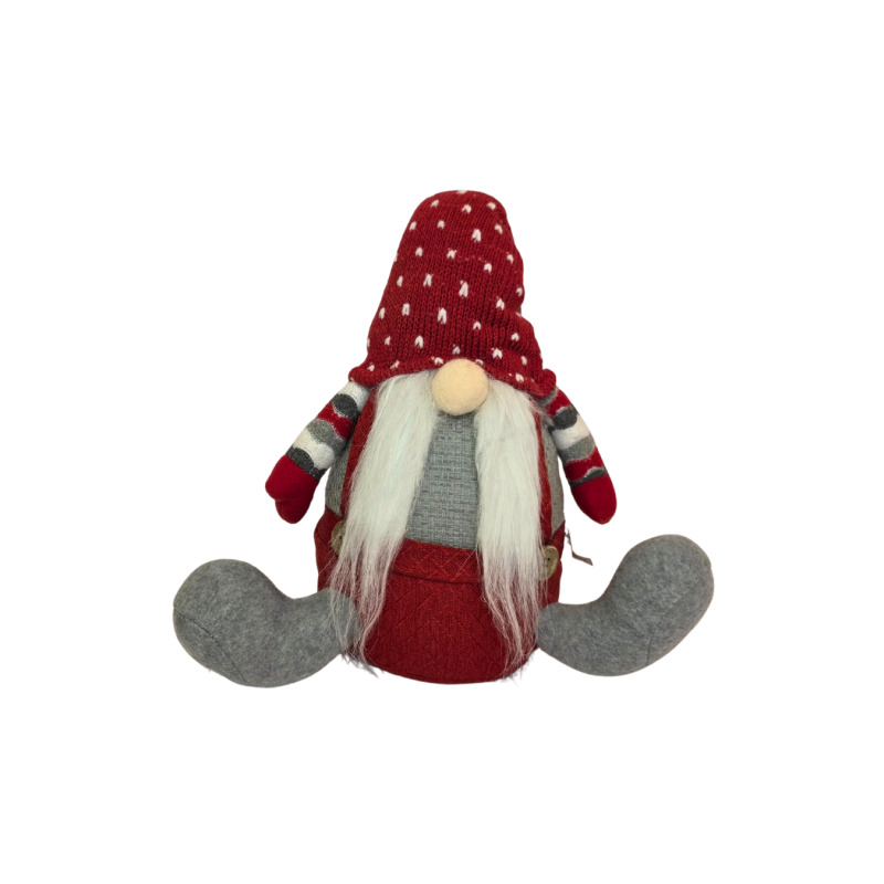 Kalėdinis nykštukas jauki ir žaisminga šventinė dekoracija, suteikianti namams šilumos ir džiaugsmo. Nykštukas vilki raudoną megztinį su pilkais akcentais, turi ilgą baltą barzdą ir raudoną megztą kepurę su baltomis snaigėmis. Jo dryžuotos kojinaitės suteikia ypatingo žavesio bei išskirtinumo. Puikiai tinka padėti ant lentynos, palangės ar po eglute, sukuriant kalėdinės pasakos nuotaiką.