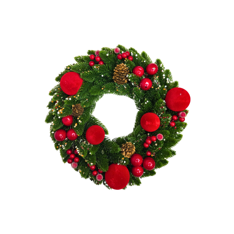 Kalėdinis vainikas – tradicinės raudonos ir žalios spalvų derinys, sukuriantis tikrą Kalėdų nuotaiką. Dekoruotas raudonais burbulais, blizgančiomis uogomis, natūraliomis kankorėžėmis ir švelniais blizgučių akcentais, šis vainikas atrodo šventiškai ir jaukiai. Puikiai tinka kabinti ant durų, sienos ar naudoti kaip stalo dekoraciją per šventes.
