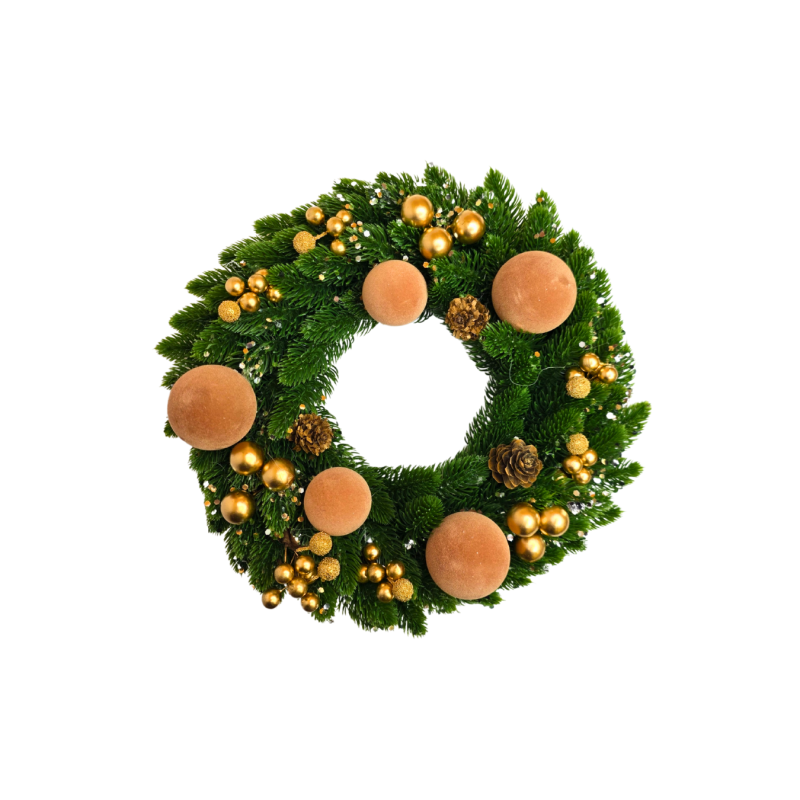 Kalėdinis vainikas – prabangi ir šilta šventinė dekoracija, suteikianti namams jaukumo bei išskirtinės elegancijos. Žalios eglės šakelės puoštos auksiniais burbulais, spindinčiais akcentais ir natūraliomis kankorėžėmis. Minkšti, aksominiai auksinės spalvos burbulai suteikia vainikui subtilaus prabangos žavesio. Tinka kabinti ant durų, sienos ar naudoti kaip stalo dekoraciją.