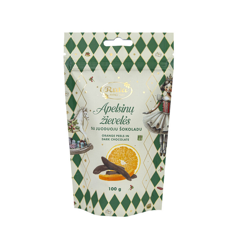 Apelsinų žievelių juostelės 62 % (apelsinų žievelės (53 %), fruktozės-gliukozės sirupas, cukrus), šokoladas 38 % (kakavos masė, cukrus, kakavos sviestas, emulsiklis SOJŲ lecitinas, natūrali vanilės kvapioji medžiaga). SKAIDULINIŲ MEDŽIAGŲ ŠALTINIS. Šokolade kakavos sausųjų medžiagų – ne mažiau kaip 55 %.