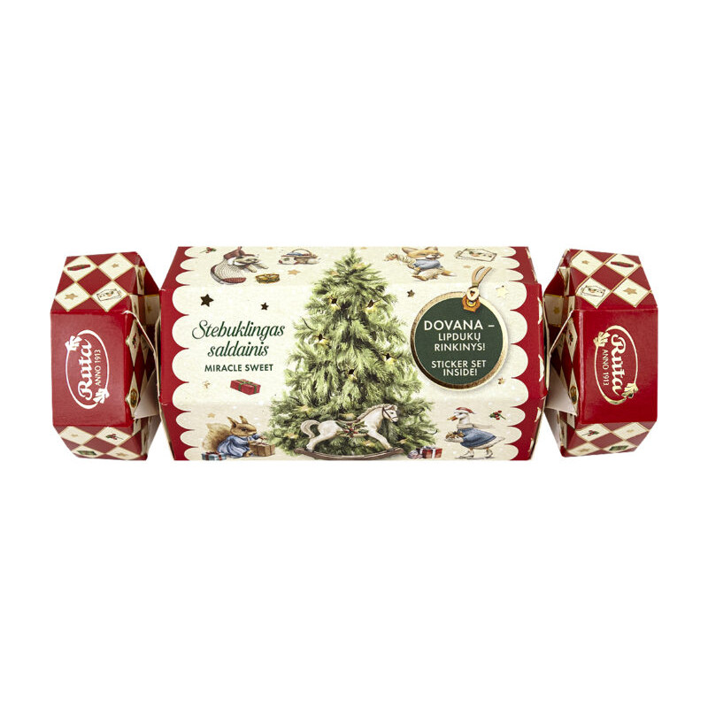 Saldainiai: SŪRIO pyrago skonio suflė saldainiai su braškėmis, traškūs rutuliukai su karameliniu glaistu, pieninis šokoladas su sproginėjančiu cukrumi „Smalsieji Bumciai“, pieninio šokolado figūros.