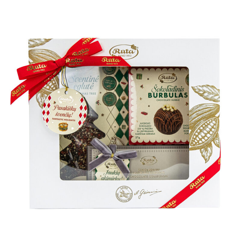 Rinkinį sudaro: Juodojo šokolado figūra su zefyriukais ŠOKOLADINIS BURBULAS karštam gėrimui (27 g); juodasis šokoladas su braškėmis ir apelsinų žievelėmis ŠVENTINĖ EGLUTĖ (100 g); šokoladinių saldainių rinkinys SKONIŲ LEGENDOS NUO 1913 (100 g).