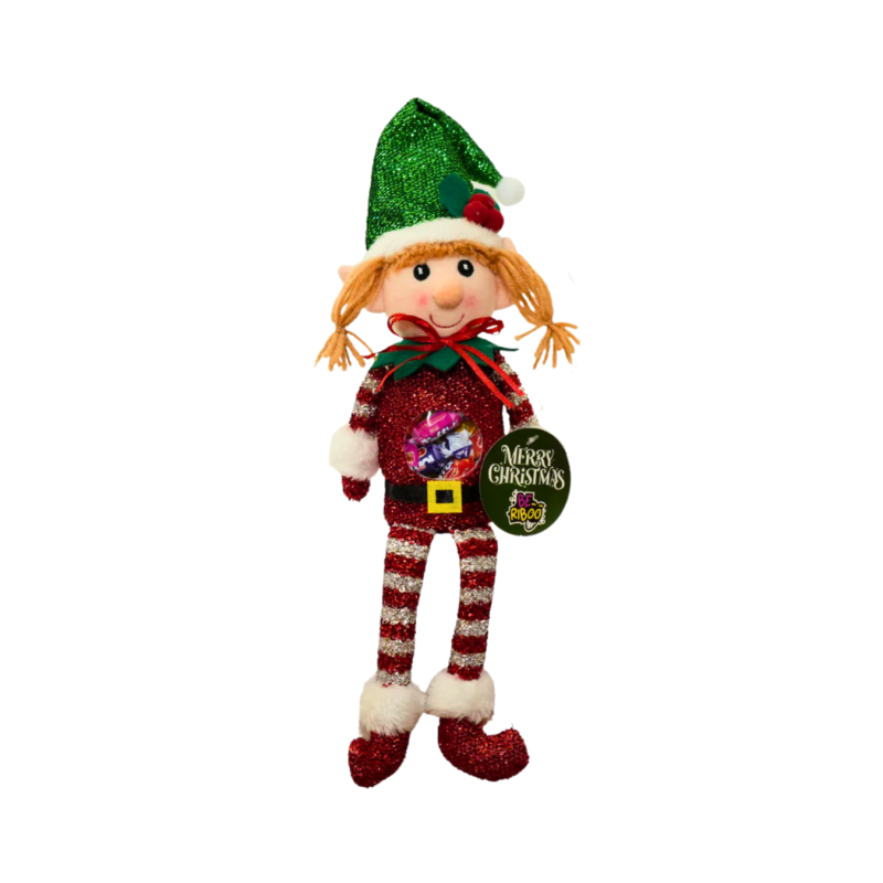 Žavingas kalėdinis elfas, pasipuošęs žalia blizgia kepuraite, raudonu kostiumu ir dryžuotomis kojytėmis, taps puikia šventine dovana ar dekoracija. Jo pilvelyje įtaisyta skaidri dėžutė su saldainiais, o nugaroje esantis užtrauktukas leidžia lengvai papildyti vidų naujais skanėstais. Tai smagi ir praktiška dovanėlė vaikams – tiek puošia namus, tiek slepia saldžią staigmeną viduje.