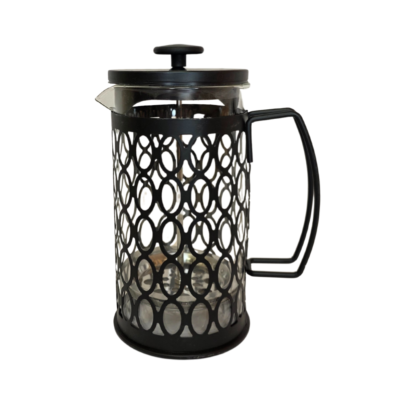 Modernus ir stilingas kavinukas / arbatinukas su dekoratyviniu juodo metalo ornamentuotu rėmeliu. Pagamintas iš karščiui atsparaus stiklo ir tvirto metalo, šis indas ne tik išsiskiria elegantišku dizainu, bet ir užtikrina patogų bei kokybišką kavos ar arbatos ruošimą. Nerūdijančio plieno filtras leidžia išgauti intensyvų, aromatingą gėrimo skonį.