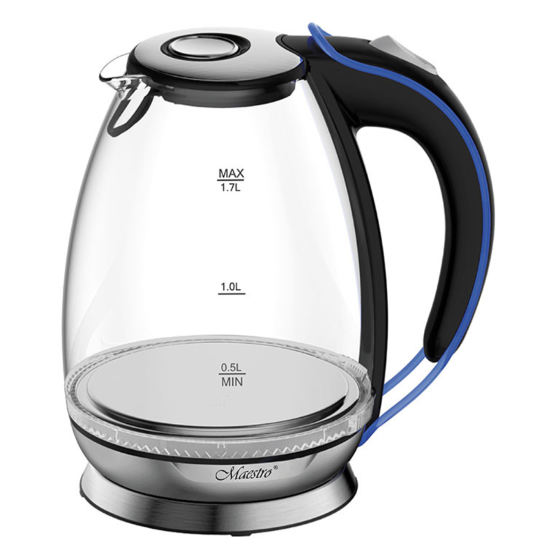 Šis modernus elektrinis virdulys išsiskiria karščiui atsparaus stiklo korpusu, kuris ne tik atrodo stilingai, bet ir leidžia patogiai stebėti vandens virimo procesą. Skaidrus dizainas, derinamas su metaliniu pagrindu ir juoda rankena su mėlynais akcentais, suteikia virduliui šiuolaikišką išvaizdą, kaip matyti nuotraukoje.