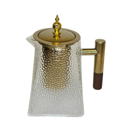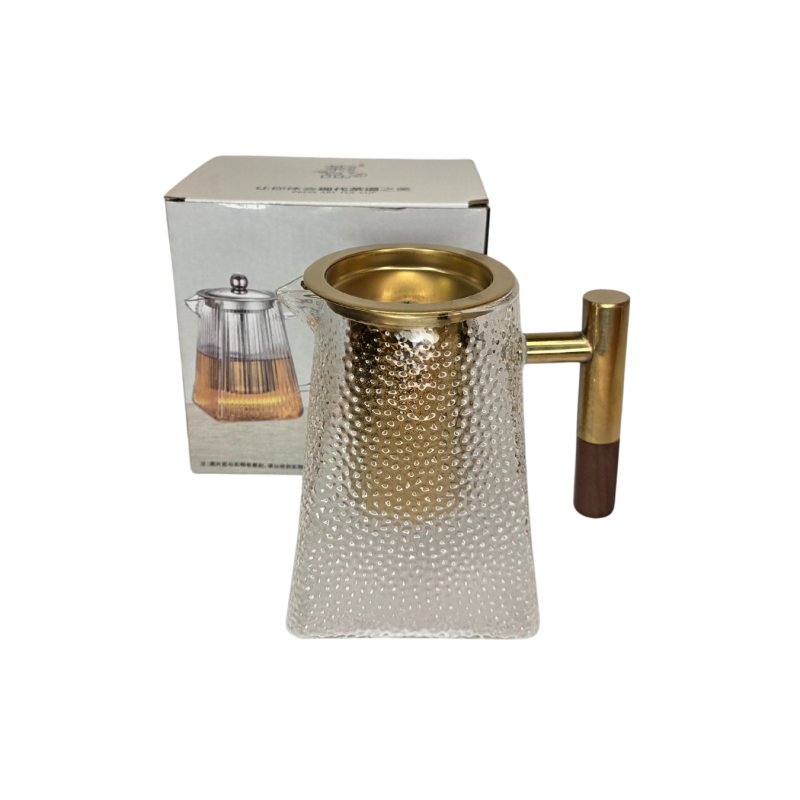 Prabangiai atrodantis 950 ml talpos arbatinukas pagamintas iš tekstūruoto, karščiui atsparaus stiklo, kuris suteikia išskirtinę estetiką ir patogų sukibimą. Viduje esantis aukso spalvos metalinis sietelis užtikrina švarų, aromatingą užpilą, sulaikant net smulkias arbatos daleles. Auksinis snapelio rėmelis ir metalinė rankena su medžio intarpu suteikia solidumo ir elegancijos.
