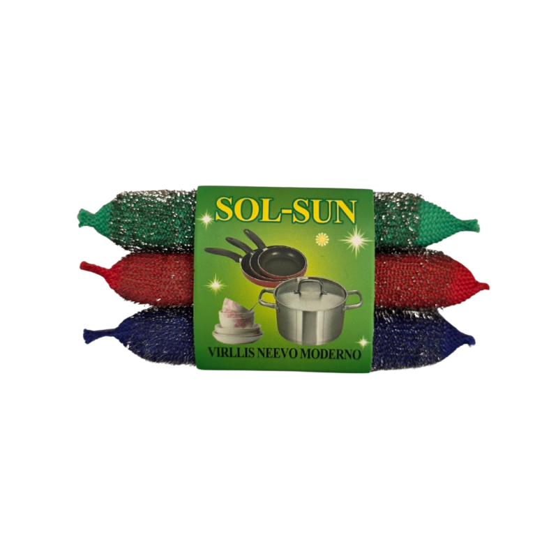 Praktiškas trijų šveistukų rinkinys, skirtas efektyviam indų, puodų, keptuvių bei kitų paviršių valymui.