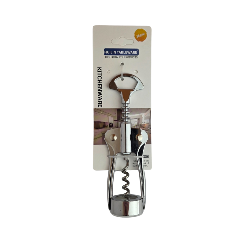 Klasikinis metalinis kamščiatraukis su dviem svirtimis – patogus ir patikimas įrankis buteliams atidaryti. Tvirtas mechanizmas leidžia lengvai ištraukti kamštį be didelių pastangų. Blizgus paviršius suteikia elegantišką išvaizdą, o ergonomiška forma užtikrina patogų naudojimą.
