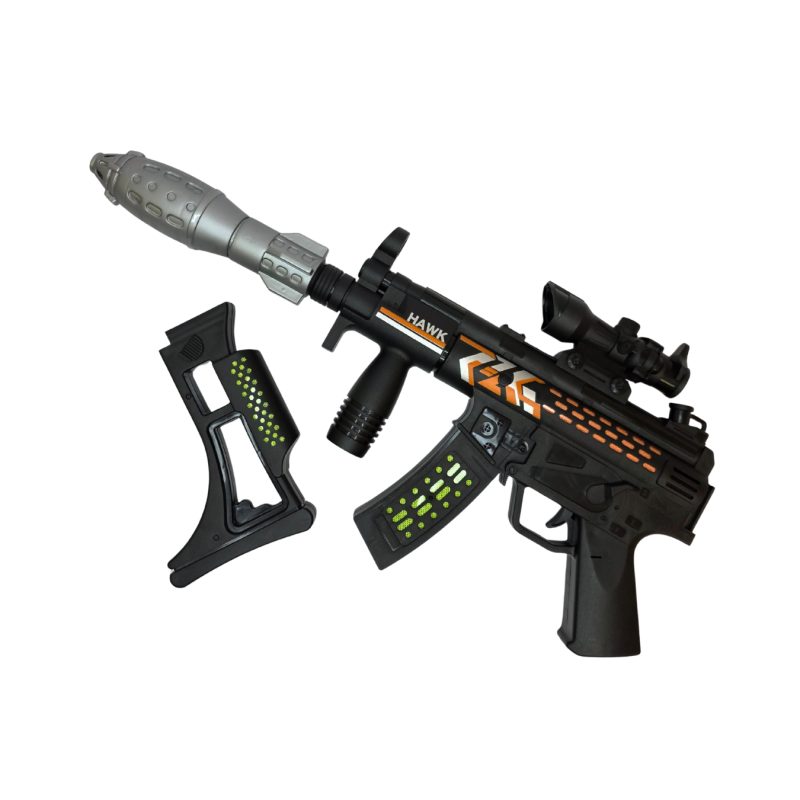 Modernus žaislinis automatinis šautuvas „HAWK“ su šviesos ir garso efektais suteiks vaikams tikro veiksmo žaidimų patirtį! Nuspaudus gaiduką, šautuvas šviečia, skleidžia šaudymo garsus, o jo išvaizda primena tikrą futuristinį ginklą.