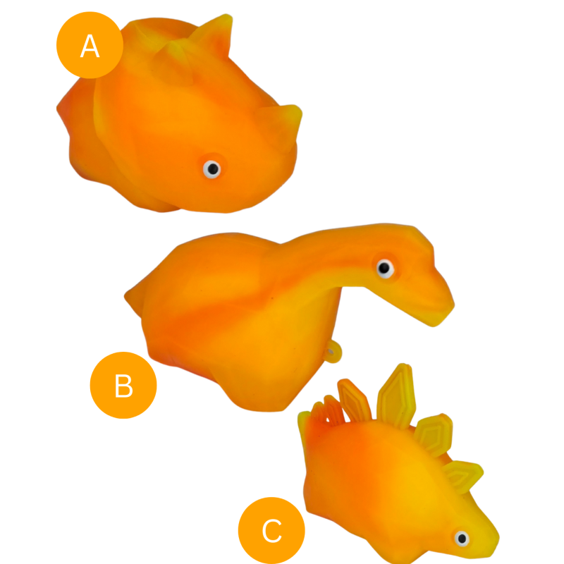 Minkštas ir elastingas antistresinis žaislas dinozauro formos, skirtas stresui mažinti, rankų mankštai ir sensorinių pojūčių lavinimui. Žaislas lengvai spaudžiamas, malonus liesti ir greitai atgauna pradinę formą.