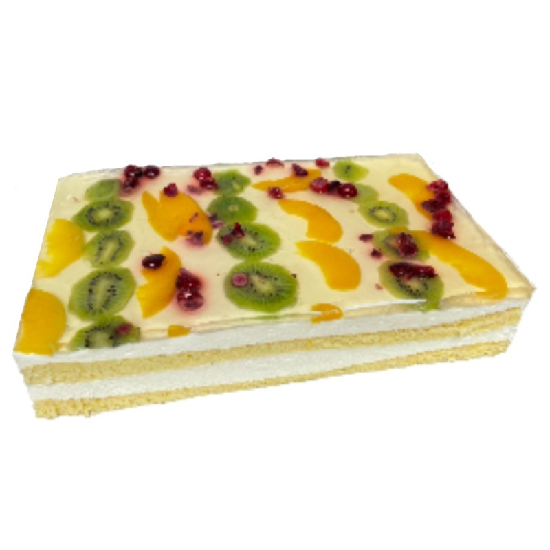 GRIETINĖLĖ 36%, (GRIETINĖLĖ); GRIETINĖ 30%; cukrus; kivi; konservuoti persikai (persikai, vanduo, cukrus, rūgštingumą reguliuojanti medžiaga citrinų rūgštis); KVIETINIAI miltai; stingdinimo milteliai grietinėlei jogurto ir žaliųjų citinų skonio (cukrus, NUGRIEBTO PIENO JOGURTO MILTELIAI, dekstrozė, žaliosios citrinos milteliai: džiovintos žaliųjų citrinų sultys, maltodekstinas, galvijų želatina, modifikuotas krakmolas, PASUKŲ MILTELIAI, kvapiosios medžiagos, tirštiklis saldžiųjų ceratonijų derva, NUGRIEBTO PIENO MILTELIAI, rūgštis citrinų rūgštis )); rapsų aliejus rafinuotas, dezodoruotas; KIAUŠINIŲ masė; SVIESTO skonio mišinys pyragų gamybai (bulvių krakmolas, ryžių miltai, cukrus, tešlos kildymo medžiagos (E450, E500, E341) stabilizatoriai (E466, E515), druska, emusiklis (E481), kvapioji medžiaga, dažiklis (E160a), rūgštis (E330)); želė milteliai claro gelb (cukrus, rūgštingumą reguliuojančios medžiagos, citrinų rūgštis, natrio citratai ir kalio fosfatai, stindikliai: karageninas, pektinas, tirštikliai, saldžiųjų ceratonių derva, gumiarabikas, destroktozė, karamelė, kvapioji medžiaga)); maistinė želatina; liofilizuotos avietės; citrinos rūgštis (citrinos rūgšties reguliuojanti medžiaga E330).