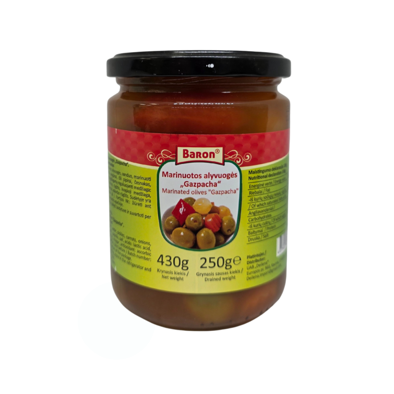Marinuotos alyvuogės „Gazpacha“. Produktas pasterizuotas.