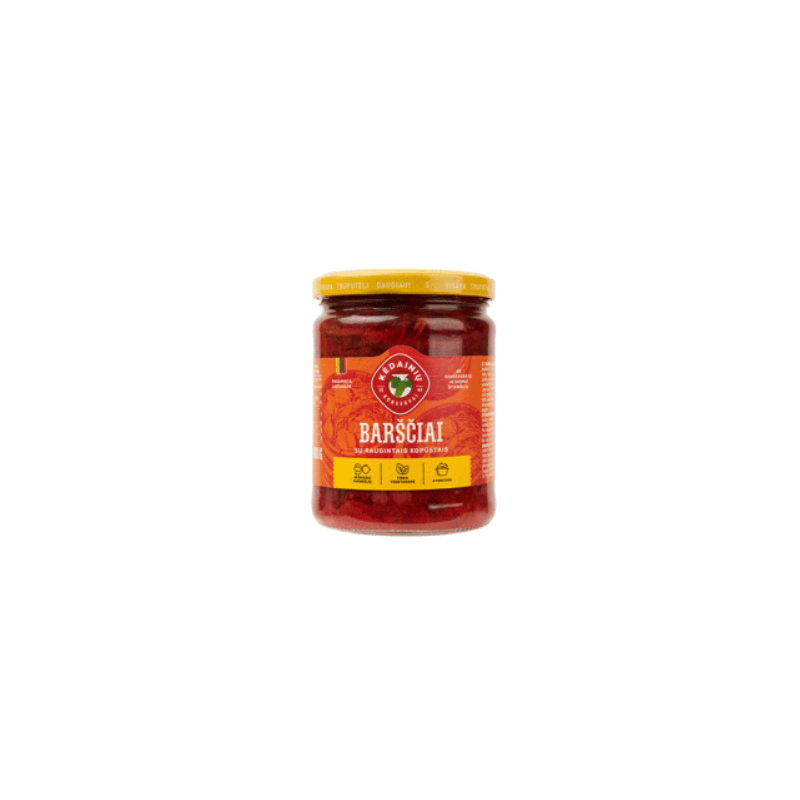 SUDEDAMOSIOS DALYS: Burokėliai (38%), daržovės įvairiomis dalimis (22%)(morkos, bulvės, svogūnai), švieži kopūstai (18%), pomidorų pasta, rapsų aliejus, druska, KVIETINIAI miltai, cukrus, česnakai, rūgštingumą reguliuojanti medžiaga - citrinų rūgštis, prieskoniai.
