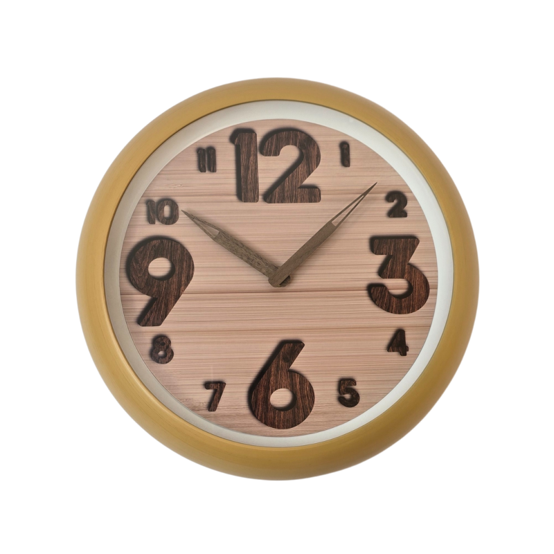 Modernus sieninis laikrodis su šiltu medžio imitacijos fonu ir išraiškingais skaičiais taps stilingu ir jaukiu interjero akcentu. Dideli, aiškiai matomi skaičiai ir minimalistinės rodyklės leidžia lengvai skaityti laiką, o natūralios spalvos suteikia laikrodžiui švelnaus elegantiškumo.