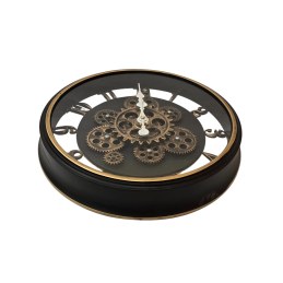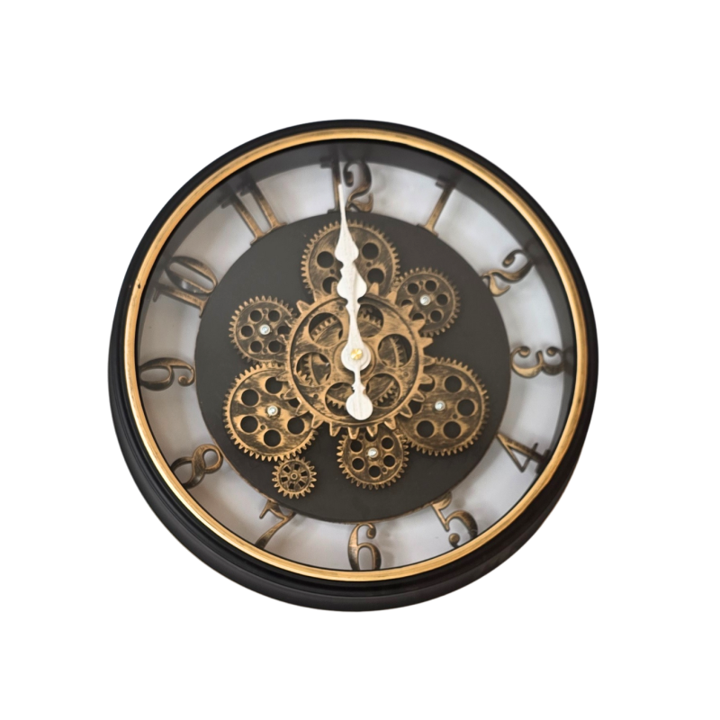 Stilingas sieninis laikrodis su matomais auksinės spalvos krumpliaračiais suteiks jūsų interjerui išskirtinumo ir industrinio žavesio. Laikrodžio fonas yra kiauras už skaičių, todėl pro jį matysis jūsų sienos spalva ar tapetų raštas – tai leidžia laikrodžiui natūraliai įsilieti į bet kokį interjerą.
