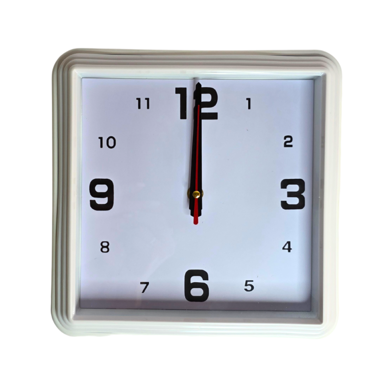 Modernus kvadratinis sieninis laikrodis su aiškiais, dideliais skaičiais ir kontrastingomis rodyklėmis. Tinkamas tiek namams, tiek biurui – minimalistinis, lengvai skaitomas dizainas puikiai dera prie įvairių interjero stilių.
