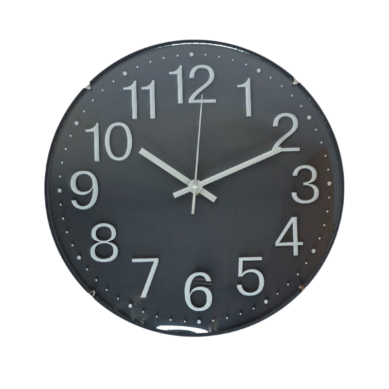 Modernus ir stilingas tamsiai pilkos spalvos sieninis laikrodis su iškiliais baltais skaičiais ir rodyklėmis. Minimalistinis dizainas suteikia laikrodžiui elegantišką išvaizdą, todėl jis puikiai tiks tiek namų, tiek biuro interjere.