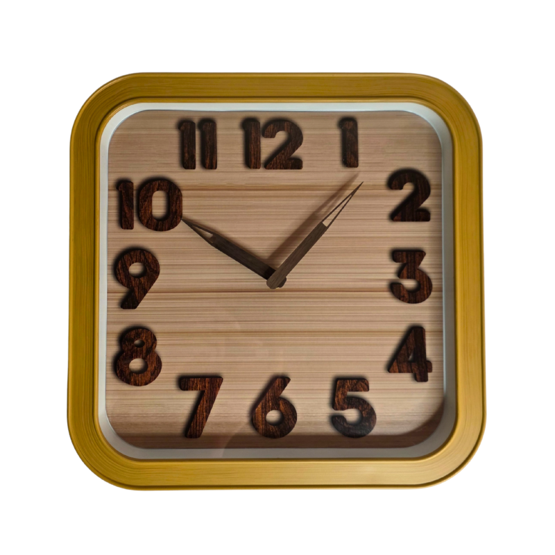 Stilingas medžio imitacijos sieninis laikrodis su rudu fonu ir iškeltomis 3D skaičių detalėmis. Auksinės spalvos rėmelis suteikia elegancijos ir išskirtinumo, todėl laikrodis puikiai dera tiek klasikiniame, tiek moderniame interjere.