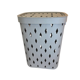 Erdvus ir praktiškas plastikinis skalbinių krepšys su dangčiu, dekoruotas deimantų rašto skylutėmis, užtikrinančiomis gerą oro cirkuliaciją. Lengvas, patogus nešti dėl integruotų rankenų, puikiai tinka vonios kambariui ar skalbyklai.