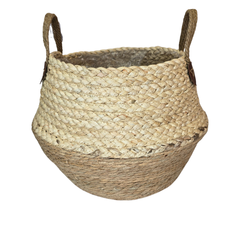 Natūralaus dizaino pintas krepšelis pagamintas iš tvirtų šiaudų, su patogiomis rankenomis. Vidus išklotas vandeniui atsparia plastikine plėvele, kuri apsaugo nuo drėgmės ir pažeidimų. Šis krepšelis puikiai tinka tiek gėlėms ar augalams kaip vazonas, tiek daiktų laikymui ar dekoratyviniams sprendimams.