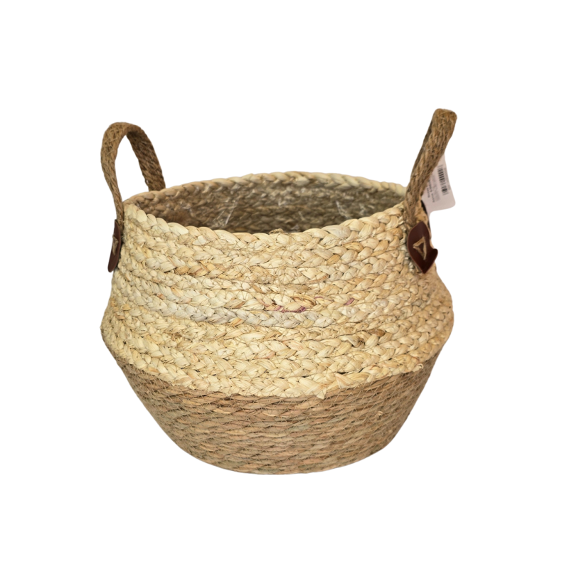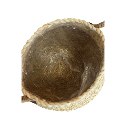 Natūralaus dizaino pintas krepšelis pagamintas iš tvirtų šiaudų, su patogiomis rankenomis. Vidus išklotas vandeniui atsparia plastikine plėvele, kuri apsaugo nuo drėgmės ir pažeidimų. Šis krepšelis puikiai tinka tiek gėlėms ar augalams kaip vazonas, tiek daiktų laikymui ar dekoratyviniams sprendimams.