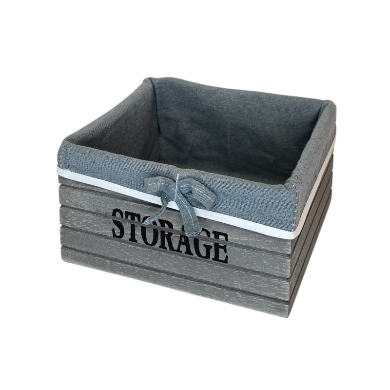 Stilingas medinis krepšelis su audinio įdėklu – praktiškas ir dekoratyvus daiktas, tinkantis tiek namų, tiek biuro aplinkai. Pilkos spalvos medinis korpusas su užrašu STORAGE ir dekoratyvine juostele bei kaspinu suteikia krepšeliui modernų, bet jaukų įvaizdį. Audinį galima išimti ir išplauti.