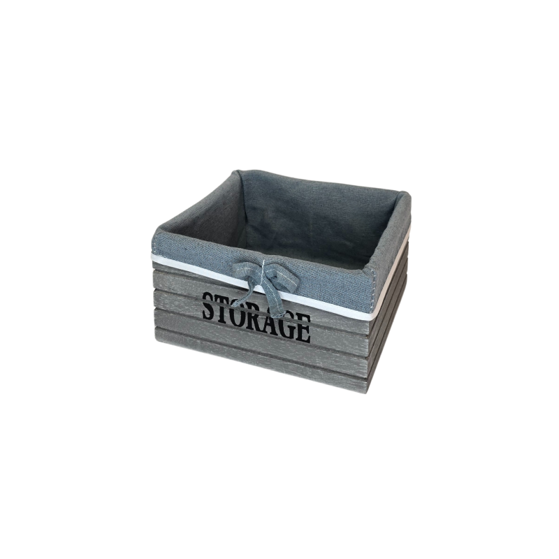 Stilingas medinis krepšelis su audinio įdėklu – praktiškas ir dekoratyvus daiktas, tinkantis tiek namų, tiek biuro aplinkai. Pilkos spalvos medinis korpusas su užrašu STORAGE ir dekoratyvine juostele bei kaspinu suteikia krepšeliui modernų, bet jaukų įvaizdį. Audinį galima išimti ir išplauti.