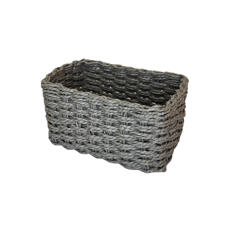 Universalaus dizaino pintas krepšelis – praktiškas sprendimas įvairiems daiktams laikyti ir tvarkai palaikyti. Pilkos spalvos pynimas suteikia modernumo ir lengvai dera prie bet kokio interjero. Krepšelis patvarus, lengvas ir patogus naudoti tiek namuose, tiek biure.