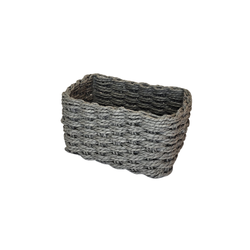 Universalaus dizaino pintas krepšelis – praktiškas sprendimas įvairiems daiktams laikyti ir tvarkai palaikyti. Pilkos spalvos pynimas suteikia modernumo ir lengvai dera prie bet kokio interjero. Krepšelis patvarus, lengvas ir patogus naudoti tiek namuose, tiek biure.